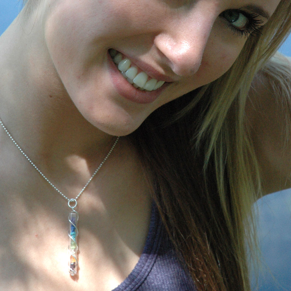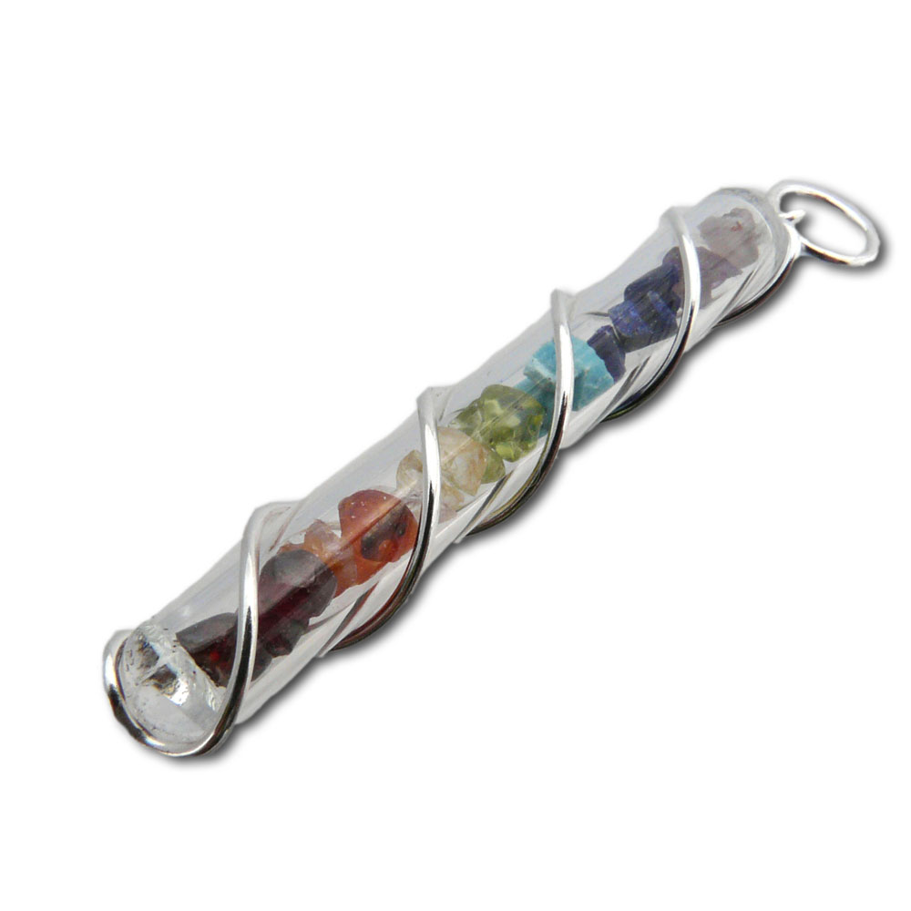 PC709 Chakra stenen hanger. Half-edelsteentjes van de zeven chakras binnen een glazen buis.